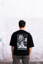 Tricoul Prâslea cel Voinic vs Zmeu din colecția Odiseea Basmului Românesc este în croi unisex și oversized, disponibil pe negru. În poză, feciorul poartă mărimea L-XL, iar mândruța poartă mărimea S-M.
